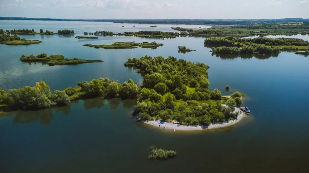 Szeroka plaża, woda i słońce — idealne miejsce na relaks, sporty wodne i rodzinny wypoczynek nad jeziorem.