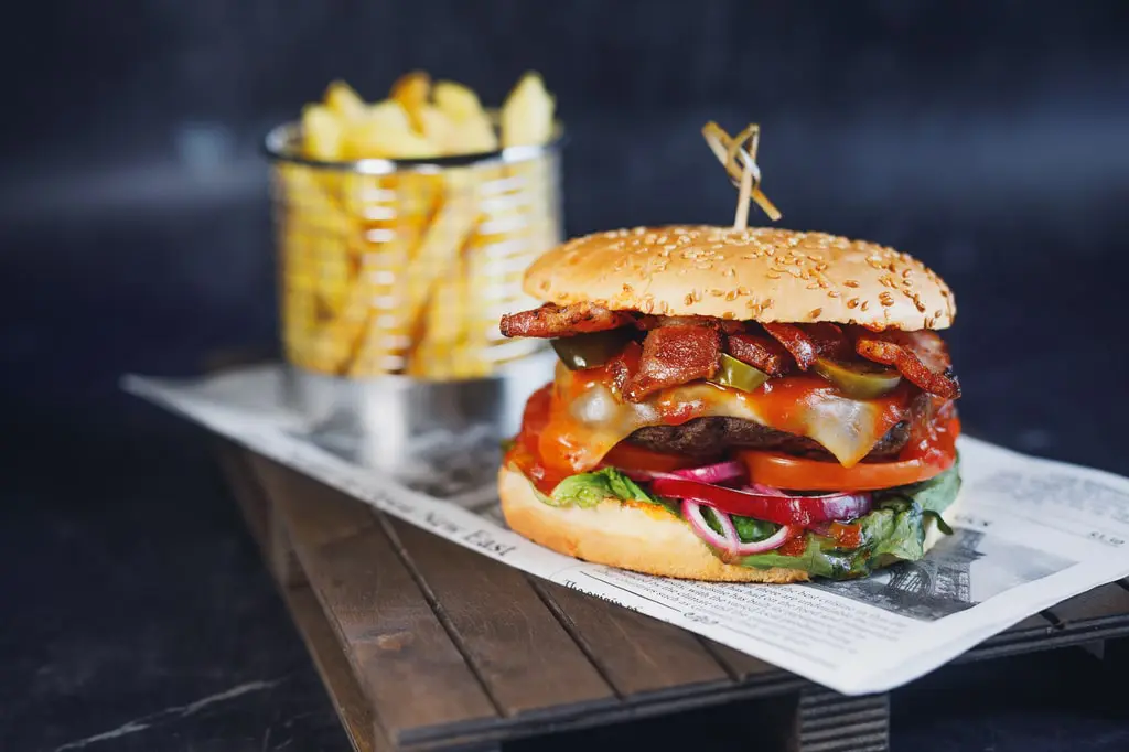 soczysta wołowina, ser żółty, ogórek konserwowy, cebula czerwona piklowana, pomidor, sałata rzymska, papryczki jalapeno, boczek grillowany, sos amerykański (ostry), sos musztardowo - paprykowy, frytki