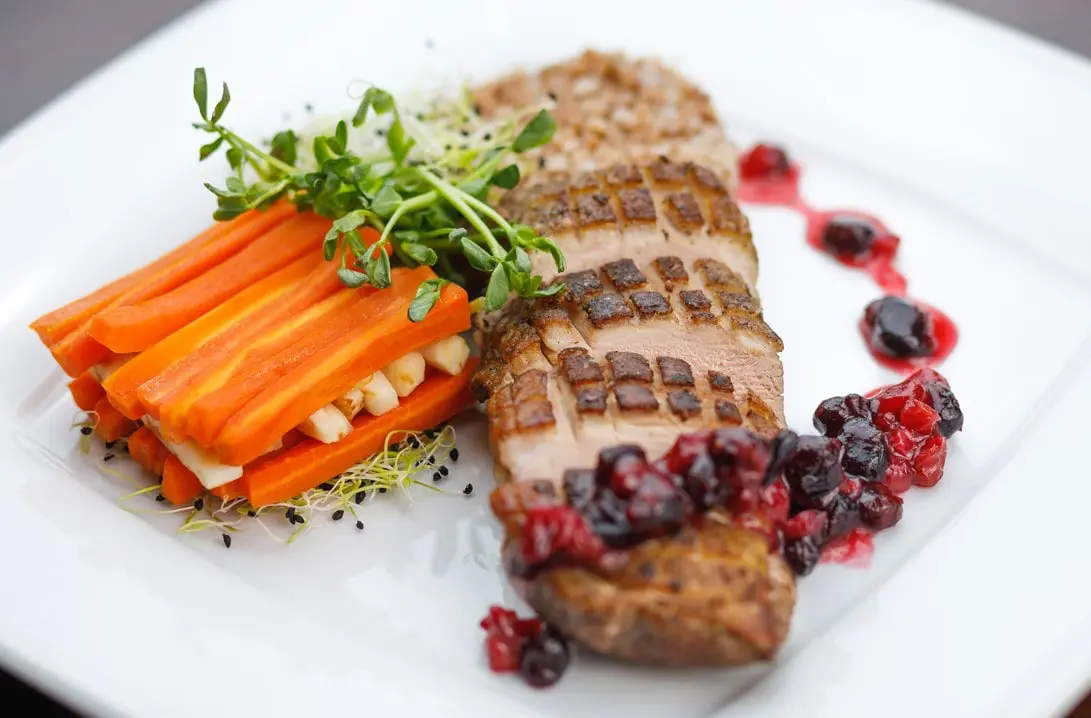Pierś z kaczki z sosem żurawinowym, kaszą gryczaną i glazurowaną marchewką oraz selerem