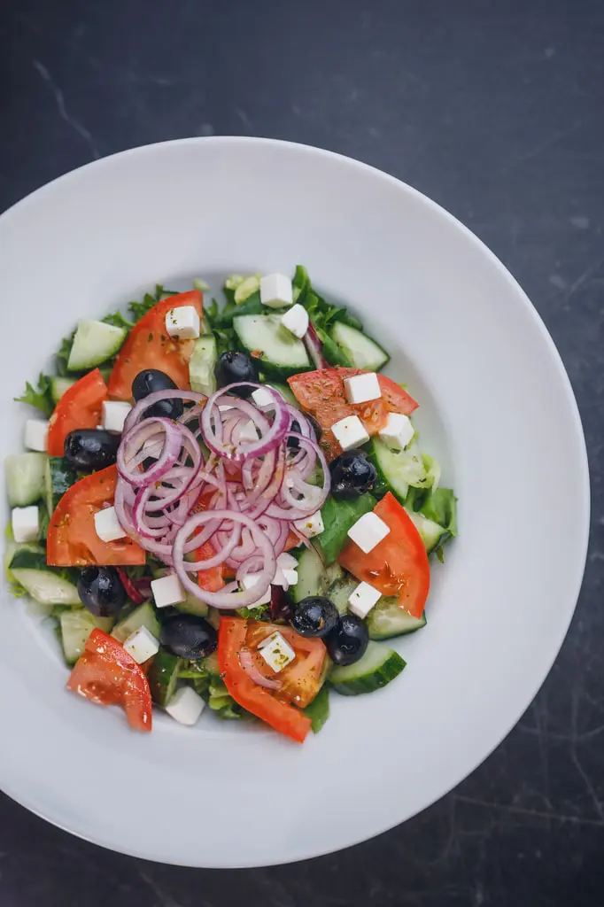 sałata lodowa, ogórek, pomidor, cebula czerwona, oliwki, ser favita w aromatycznym sosie vinegrette