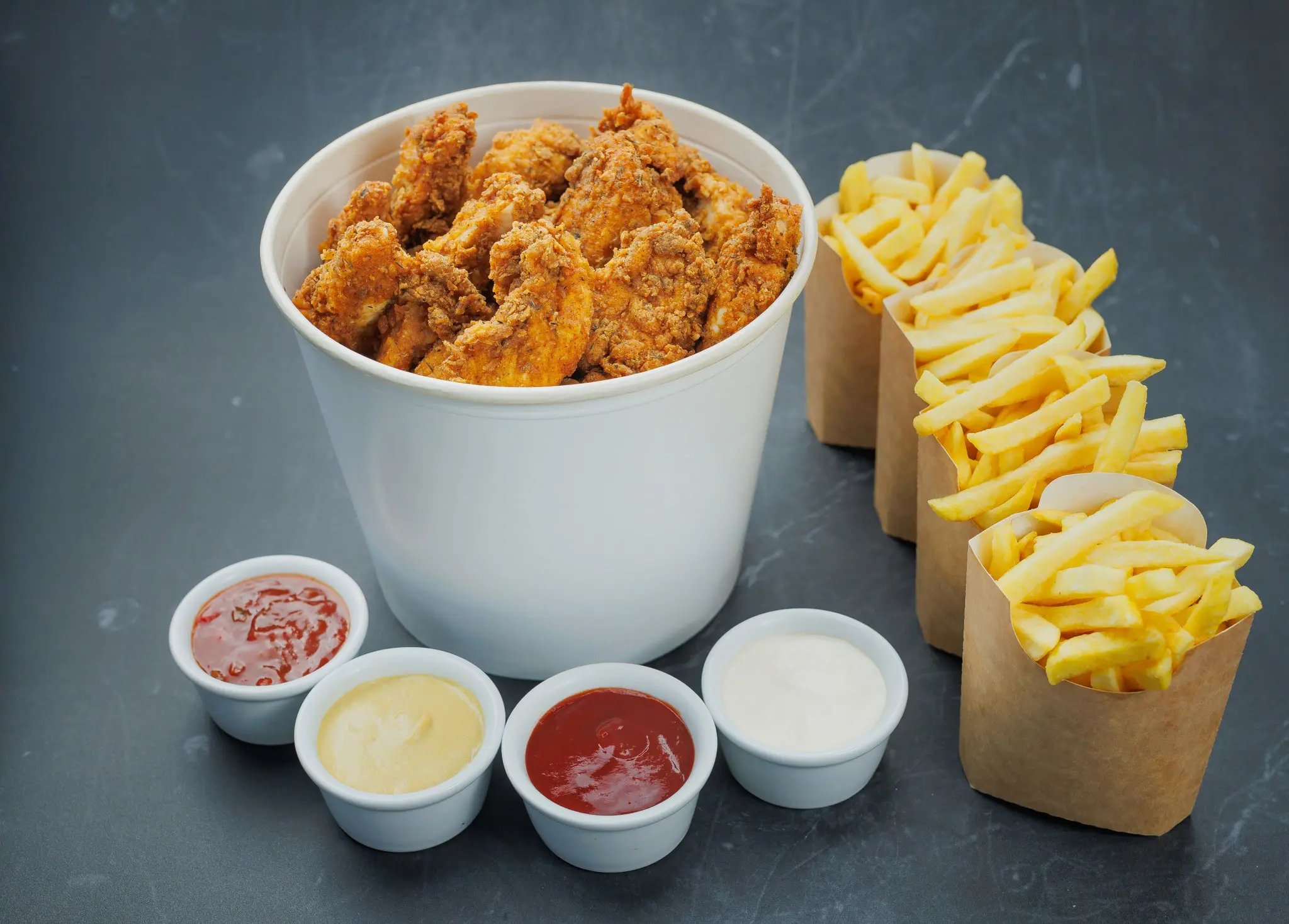 kubełek 30 stripsów z kurczaka, 4 porcje frytek, 4 sosy do wyboru